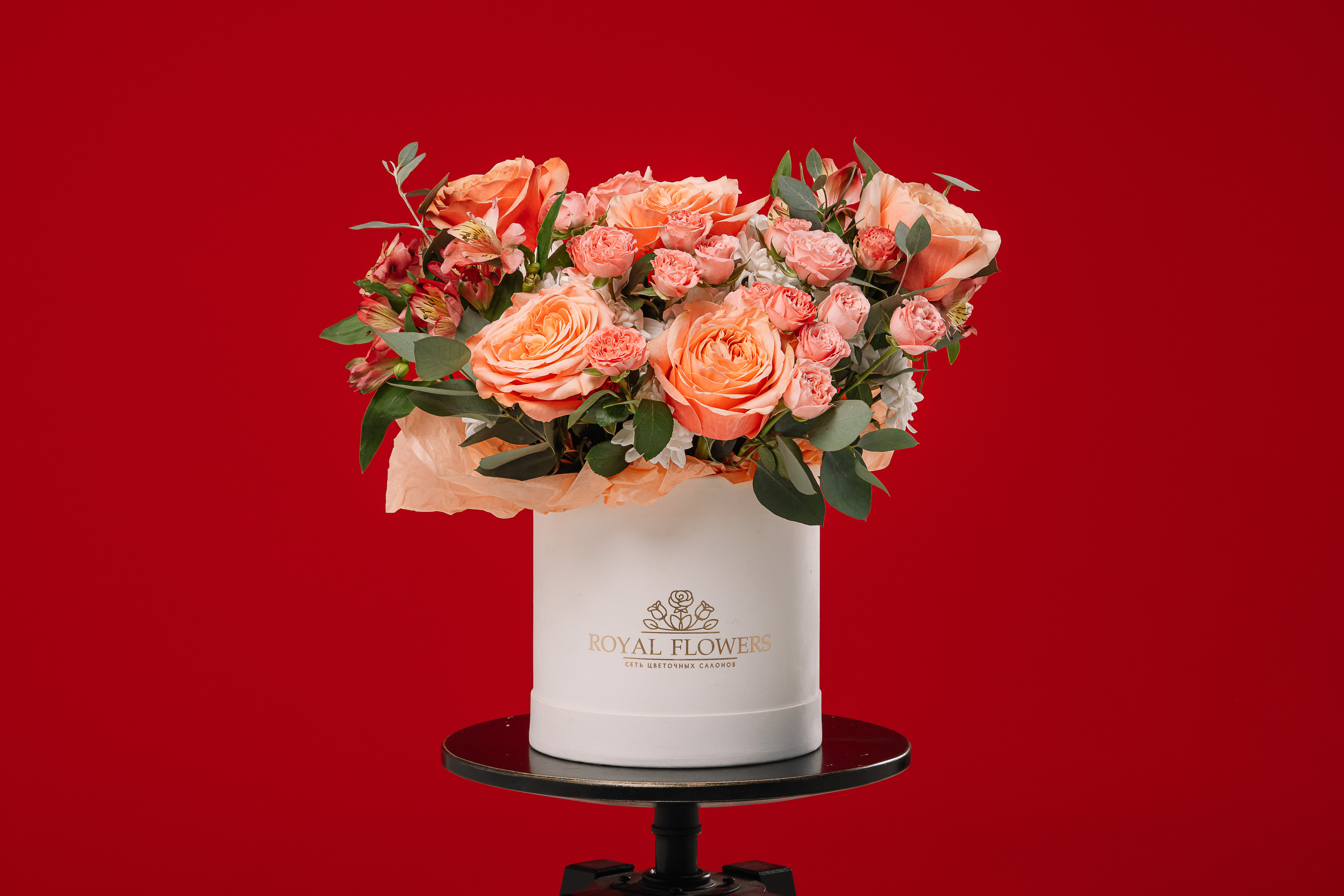 Изысканная композиция в шляпном боксе с цветами коралловых оттенков. Оригинальный подарок, который практически не требуют ухода.