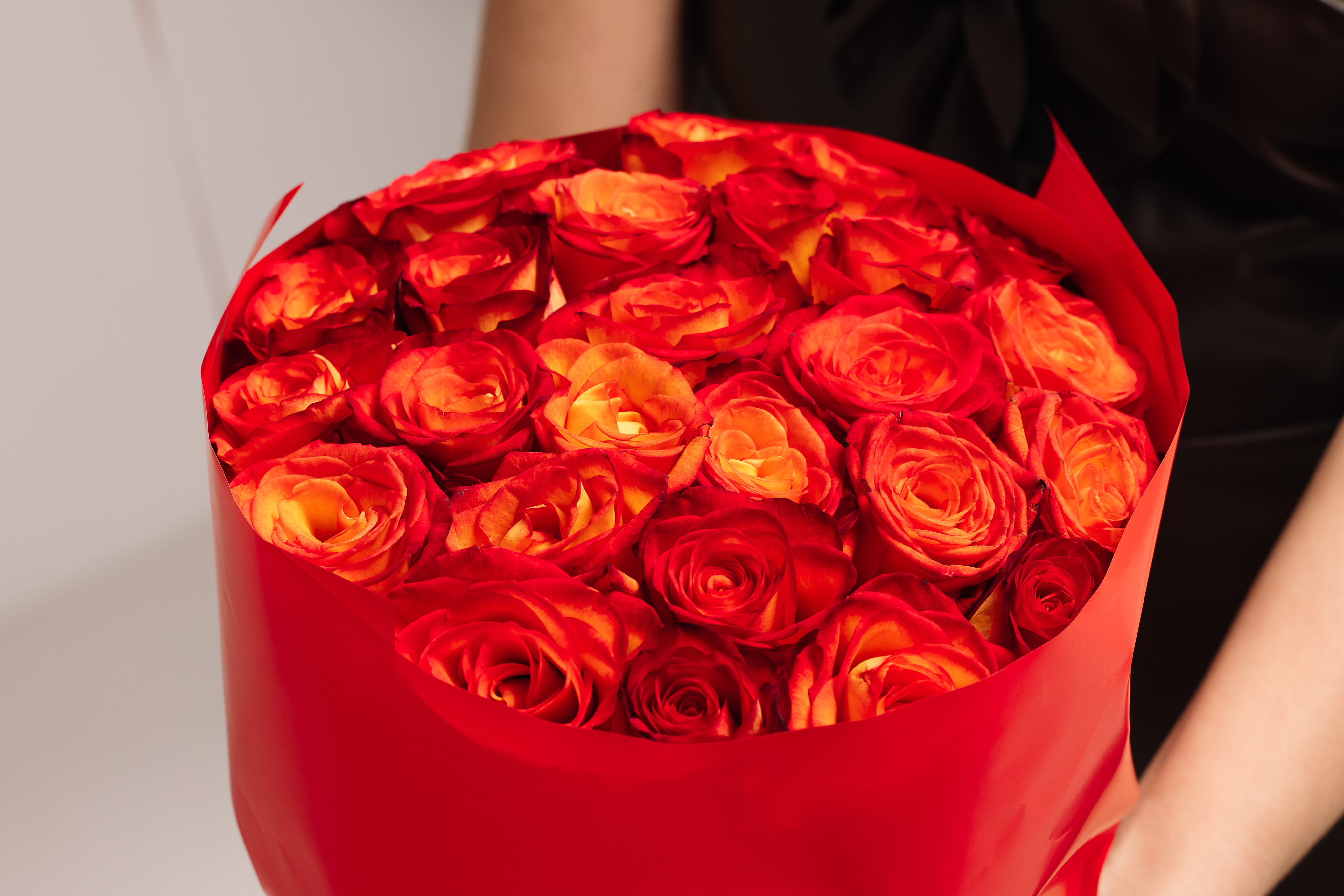 Яркий огненный букет из 25 роз оранжевого оттенка, привезённых из Кении. Крупные, стойкие бутоны подчёркивают высокое качество и свежесть каждого цветка.