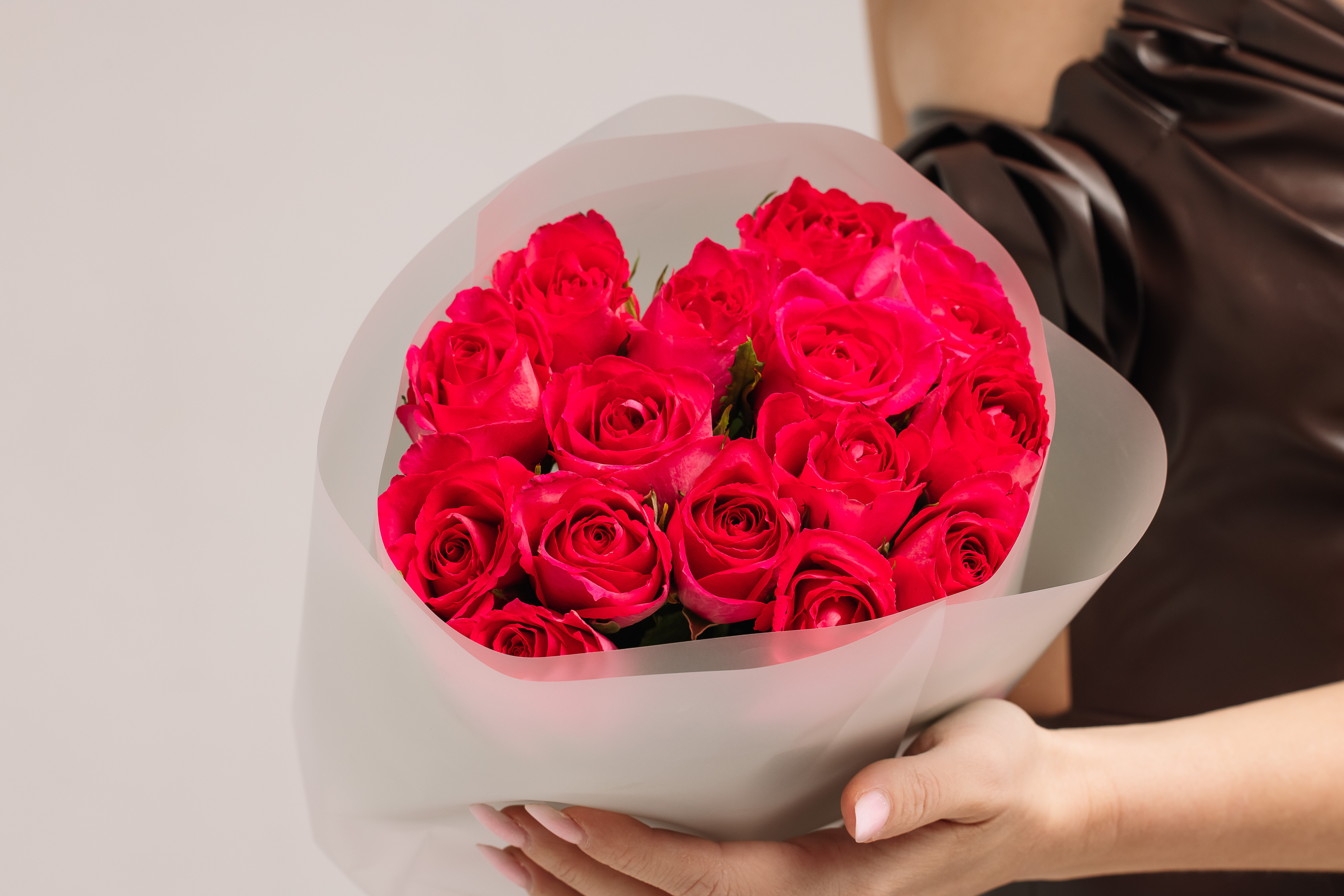 Япкий выразительный букет из 15 ярко-розовых роз, привезённых из Кении. Крупные, стойкие бутоны подчёркивают высокое качество и свежесть каждого цветка.