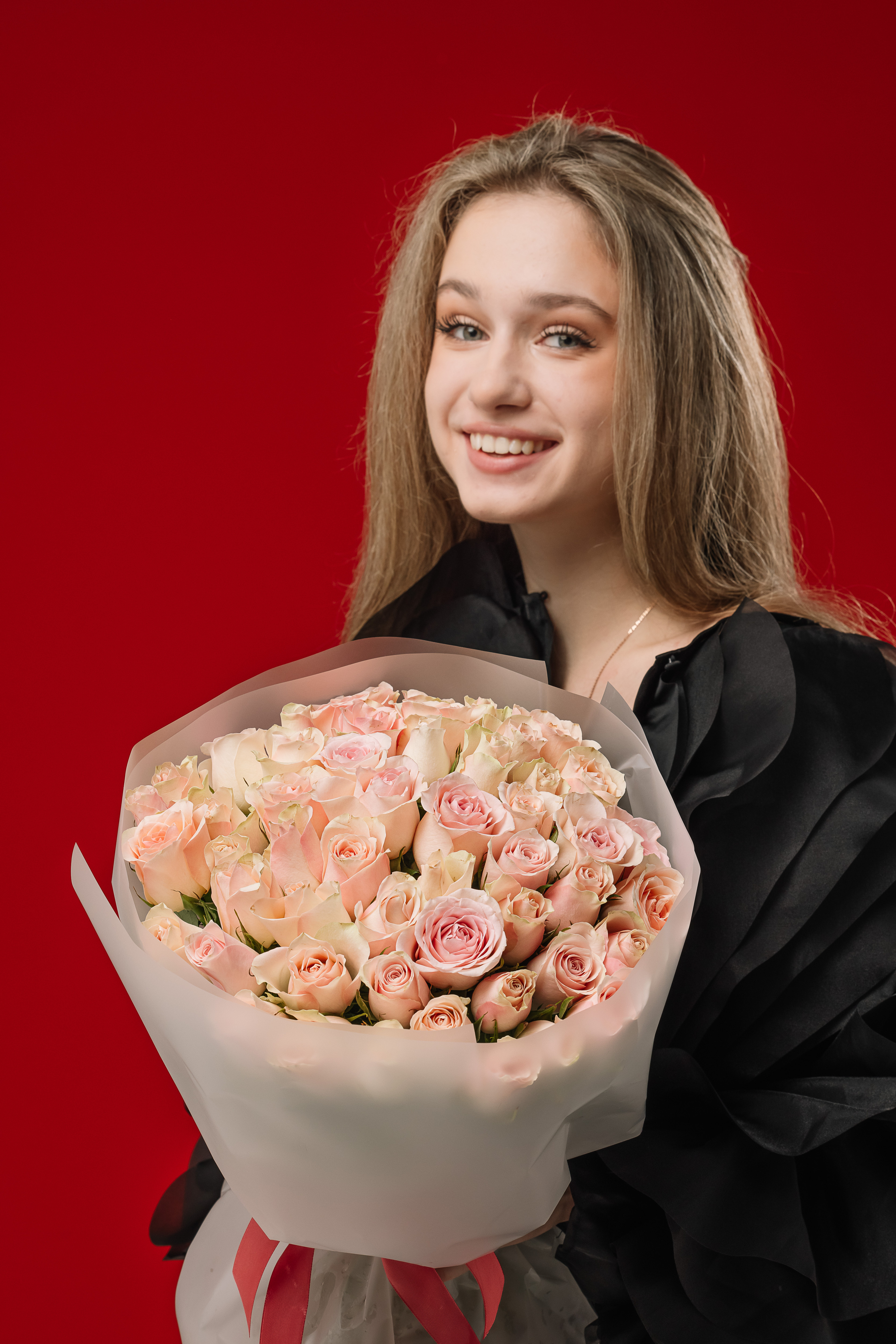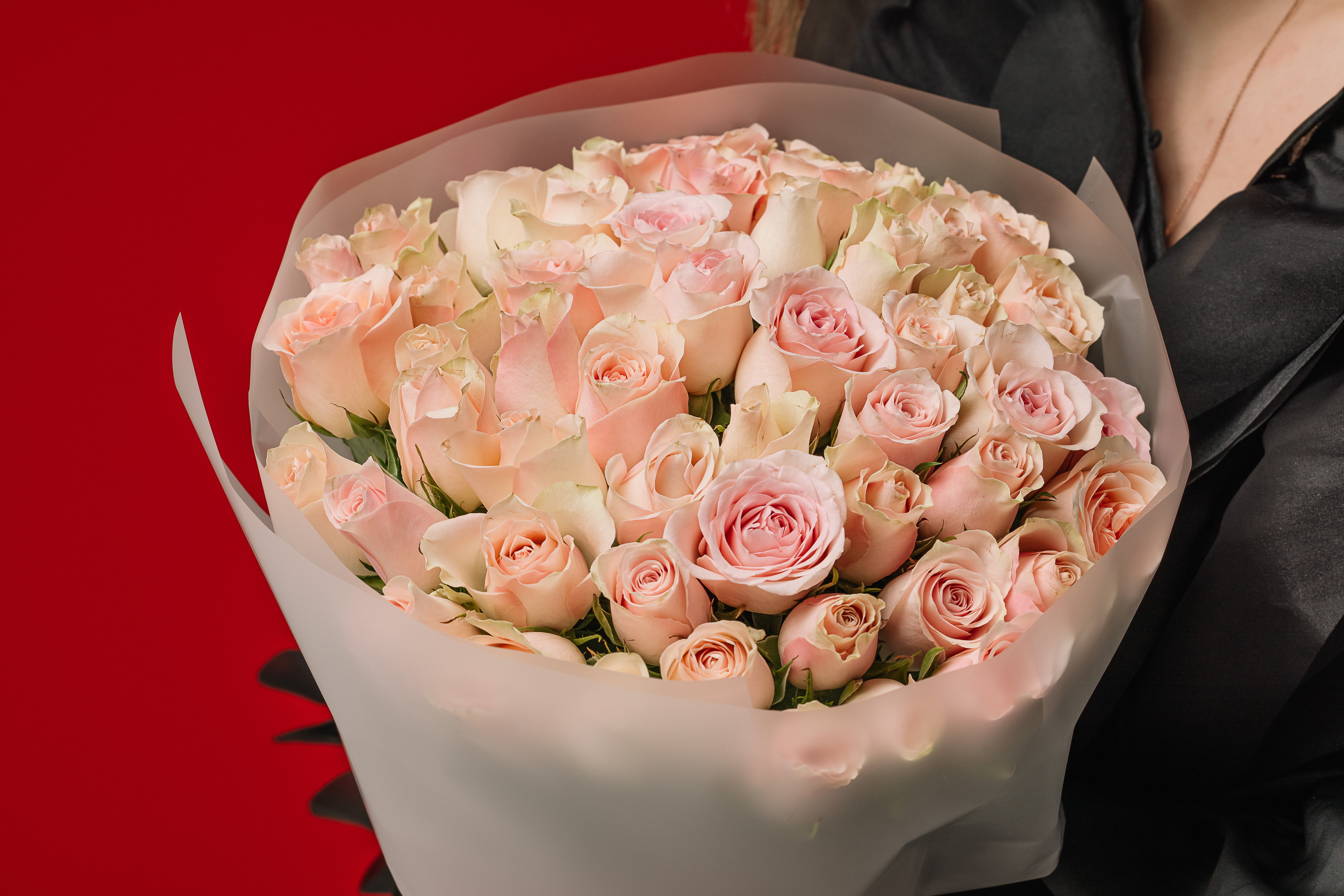 Нежно-розовый акварельный оттенок символизирует сочетание трогательной нежности и элегантности. Крупные, стойкие бутоны подчёркивают высокое качество и свежесть каждого цветка.
