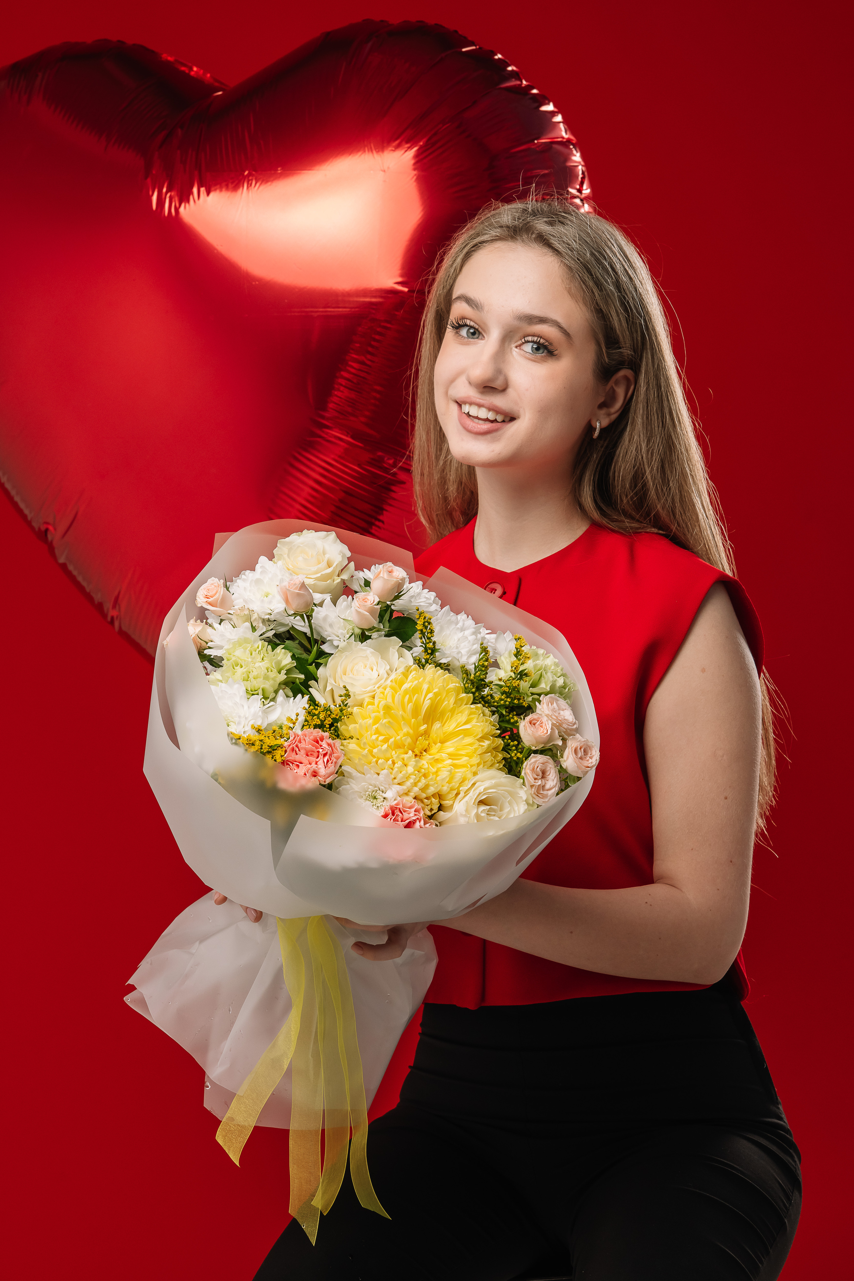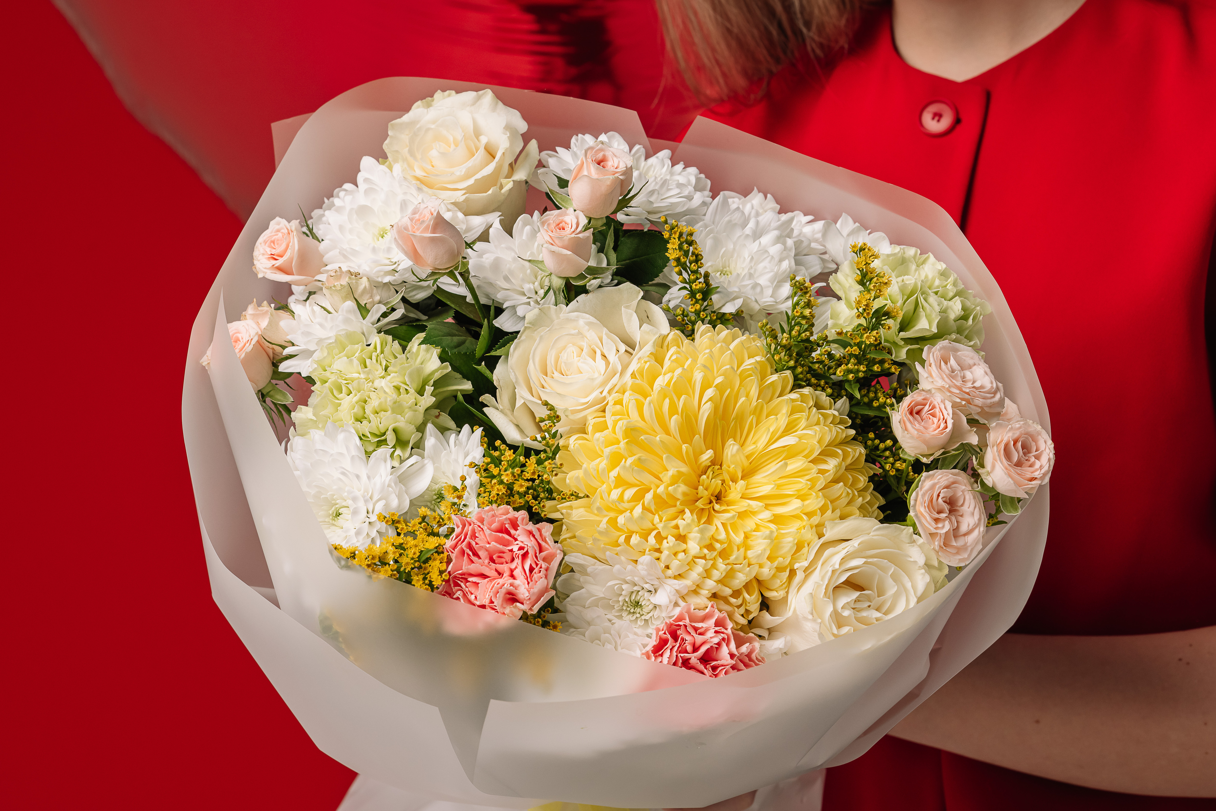 Нежнейший букет из стойких хризантем, нежных кремовых роз и пушистых солидаго.