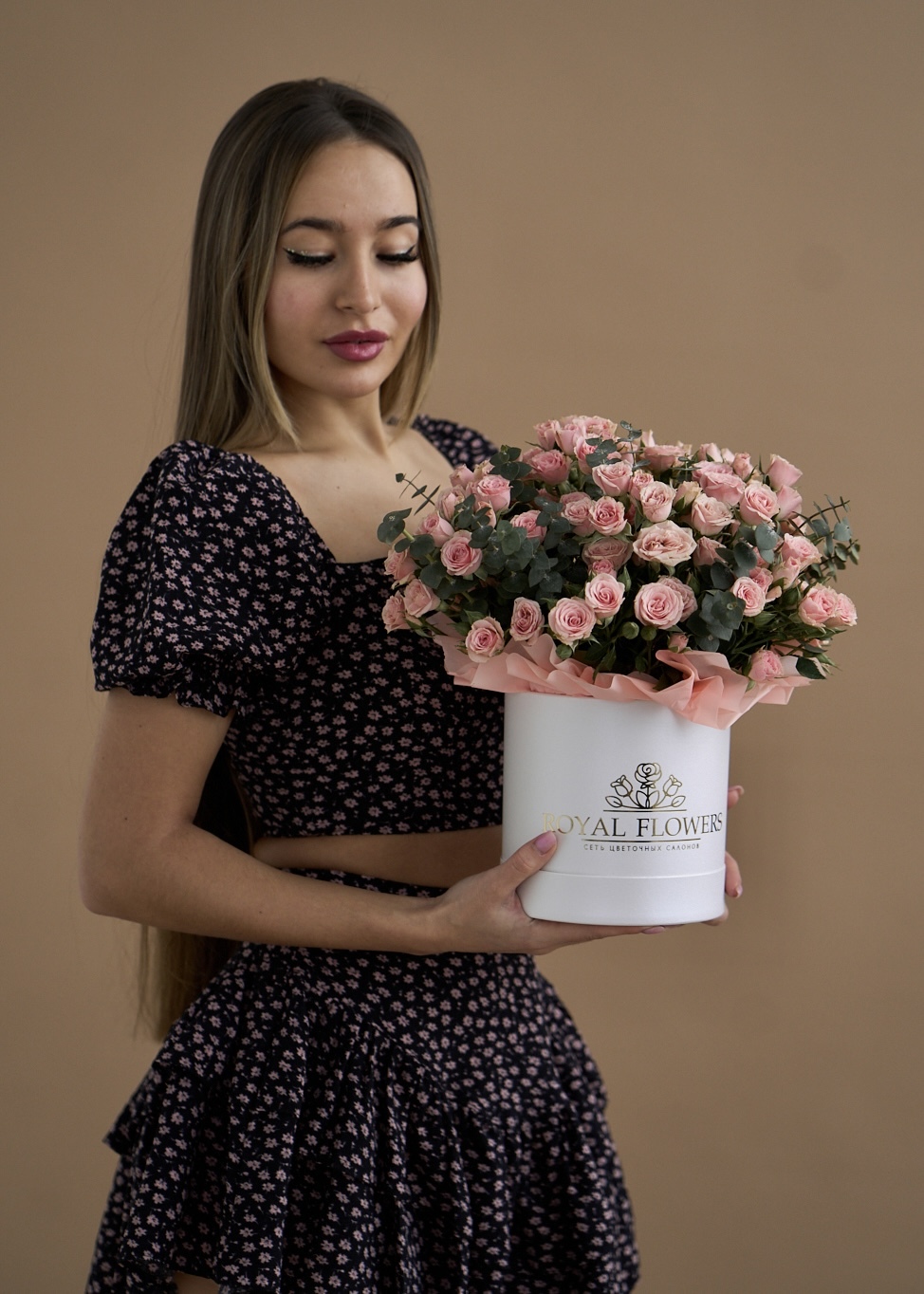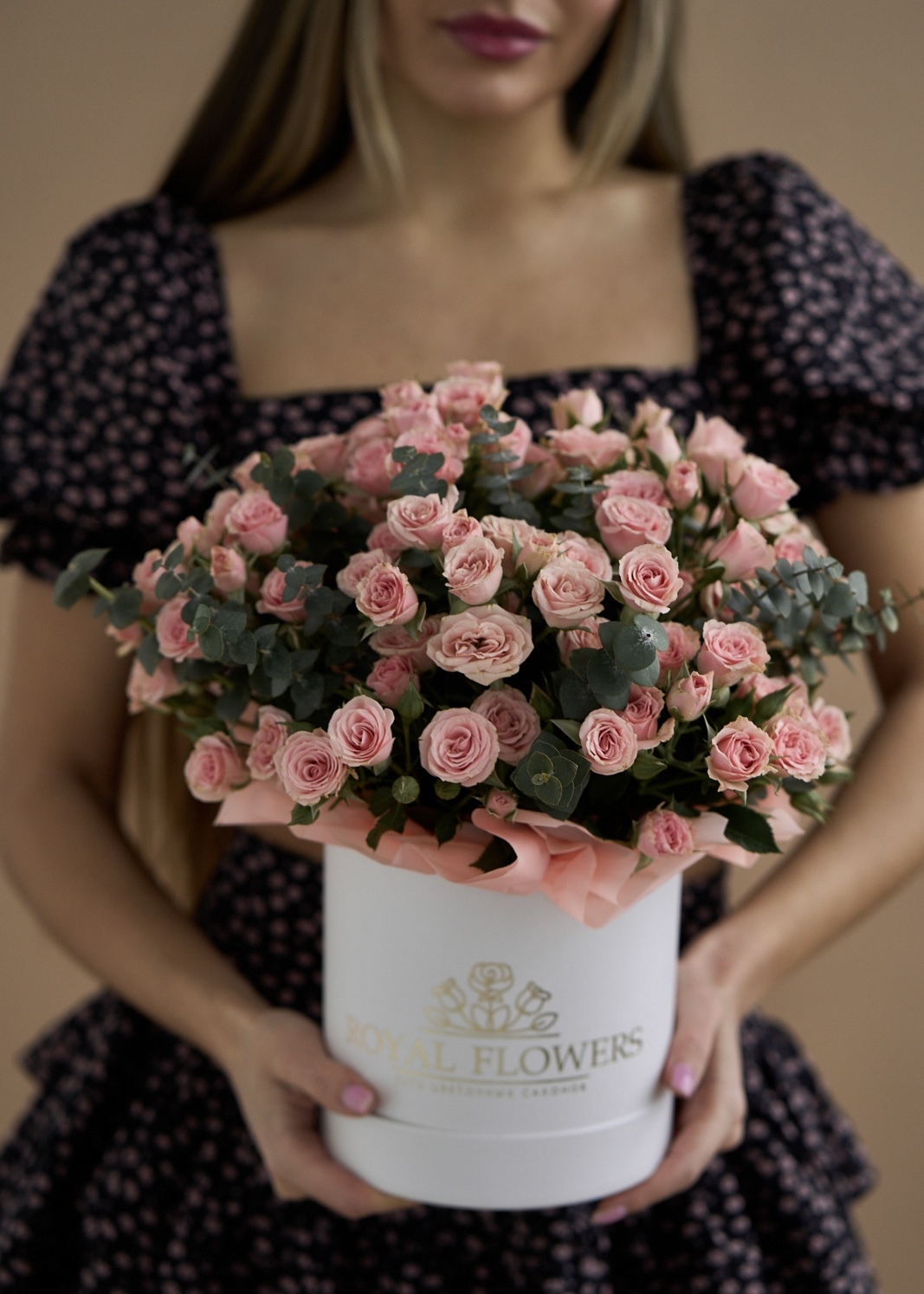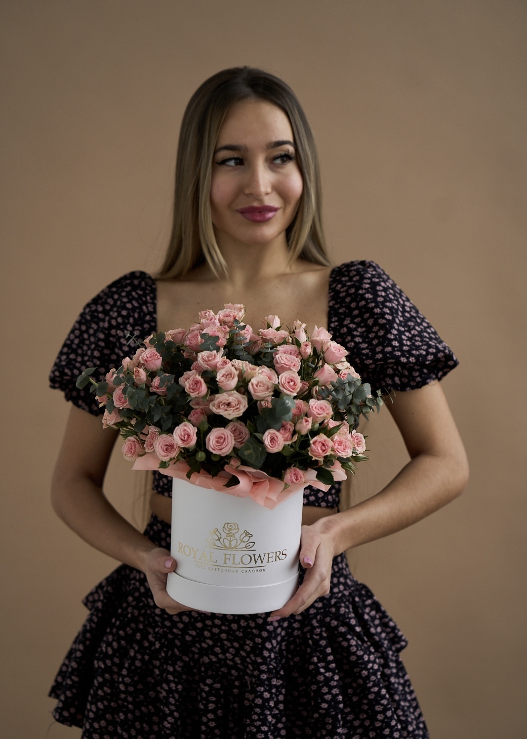Стильная композиция в шляпном боксе из нежных кустовых роз и эвкалипта. Этот универсальный подарок идеально подходит для различных случаев — от дней рождения до корпоративных мероприятий. Он также может стать центральным декоративным элементом интерьера, привнося нотку природной красоты и стиля.