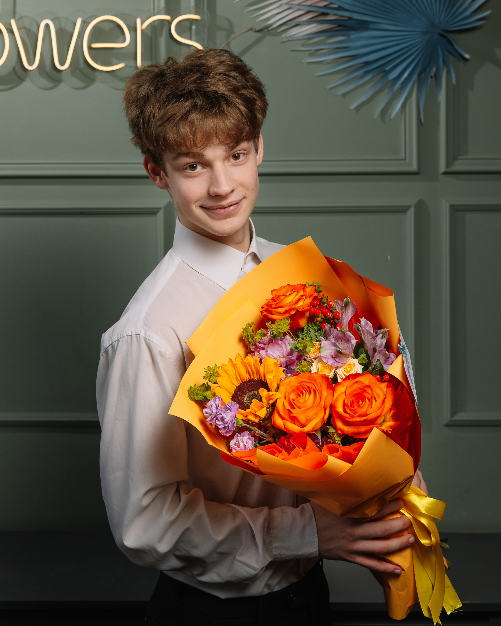 Состав: подсолнух, кустовая роза, альстромерия, 2 гиперикум, 1 хризантема кустовая, 2 буплерума, фисташка.