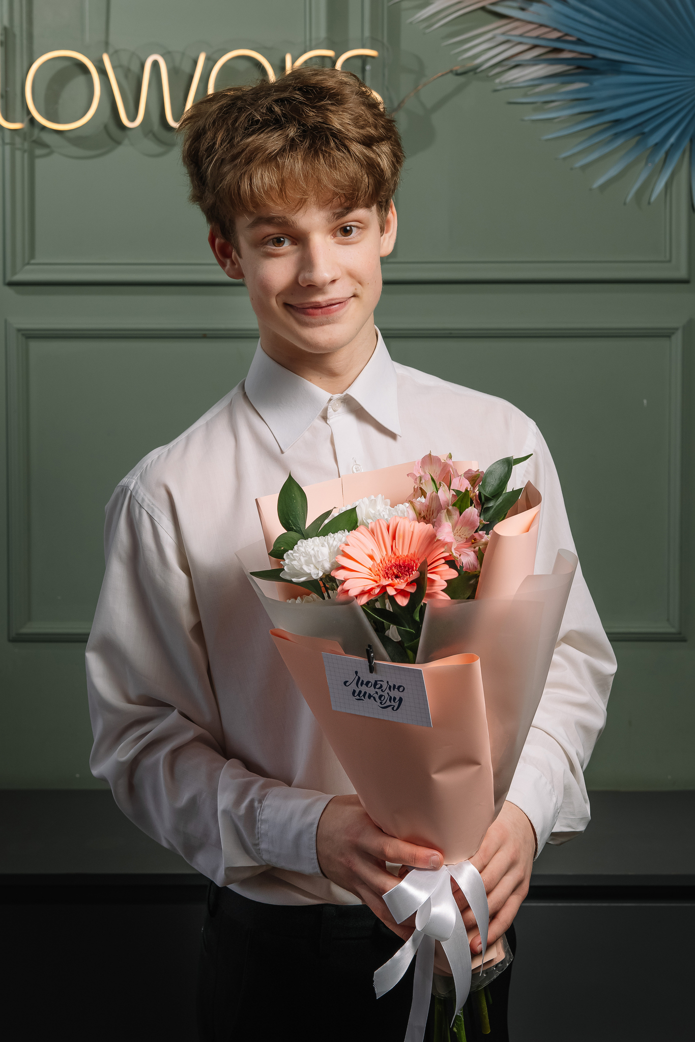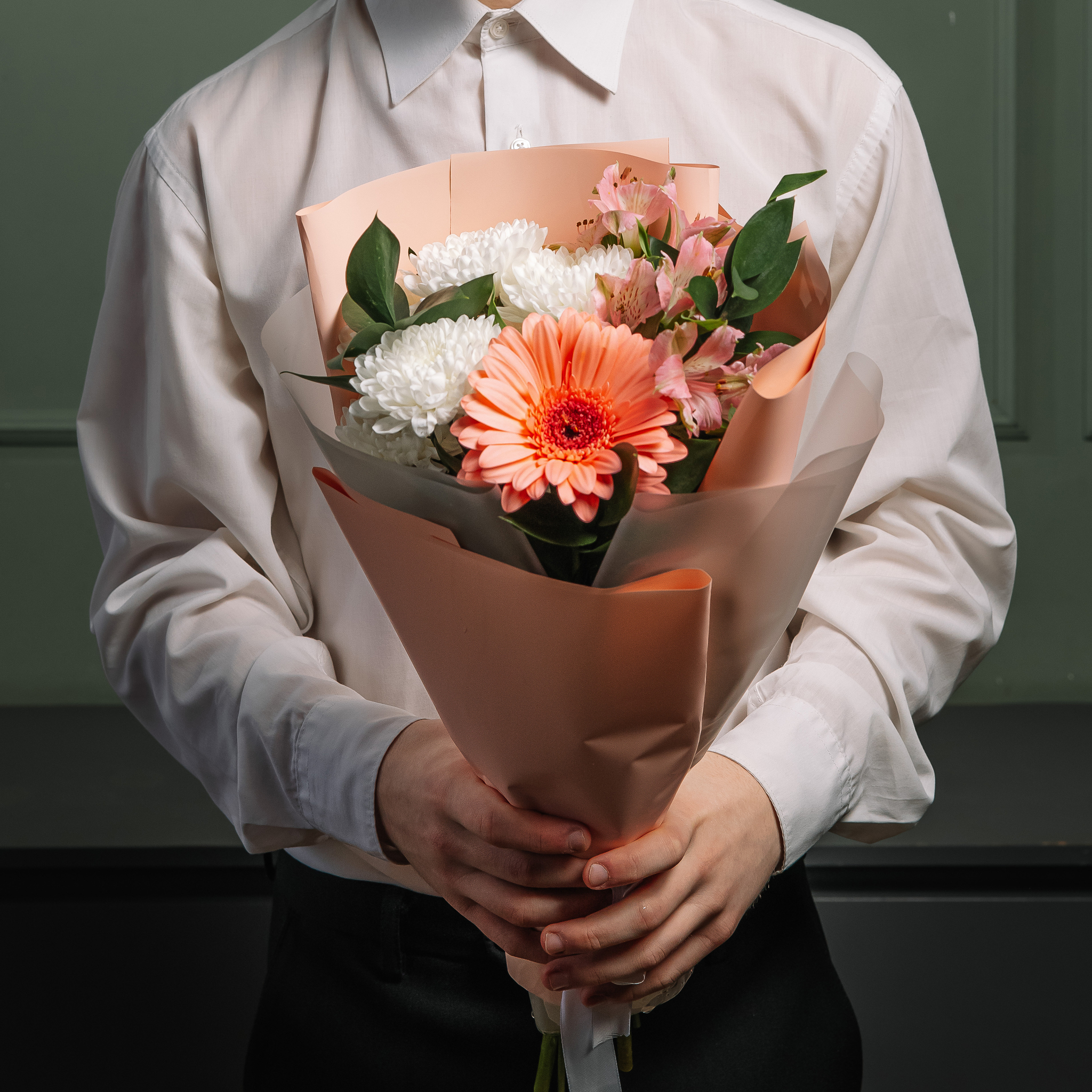 Состав: Хризантема кустовая, гербера, альстромерия, 3 рускуса.